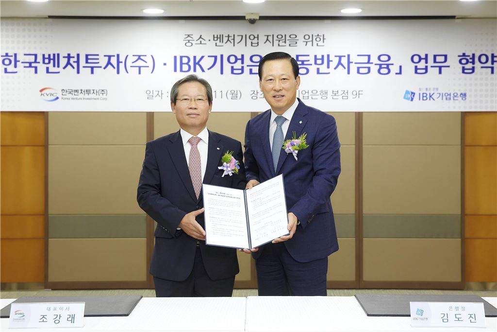 11일 서울 중구 기업은행 본점에서 김도진 기업은행장(오른쪽)과 조강래 한국벤처투자 대표이사가 협약식을 마치고 기념촬영을 하고 있다. (사진 : 기업은행)