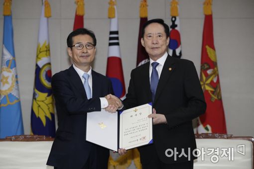 [사진공동취재단]‘국방부 5·18 특별조사위원회’가 11일 서울 용산구 국방부에서 출범해 이건리 위원장(왼쪽)이 송영무 국방부장관으로부터 위촉장을 수여받고 있다. 이건리 전 대검찰청 공판송무부장이 위원장을 맡는 위원회는 조사지원팀?헬기사격조사팀?전투기출격대기조사팀 등 3개팀으로 구성되며, 5·18 광주민주화운동 당시 헬기사격·전투기 대기 등 관련 의혹을 검증한다.강진형 기자 aymsdream@asiae.co.kr<ⓒ세계를 보는 창 경제를 보는 눈, 아시아경제(www.asiae.co.kr) 무단전재 배포금지>