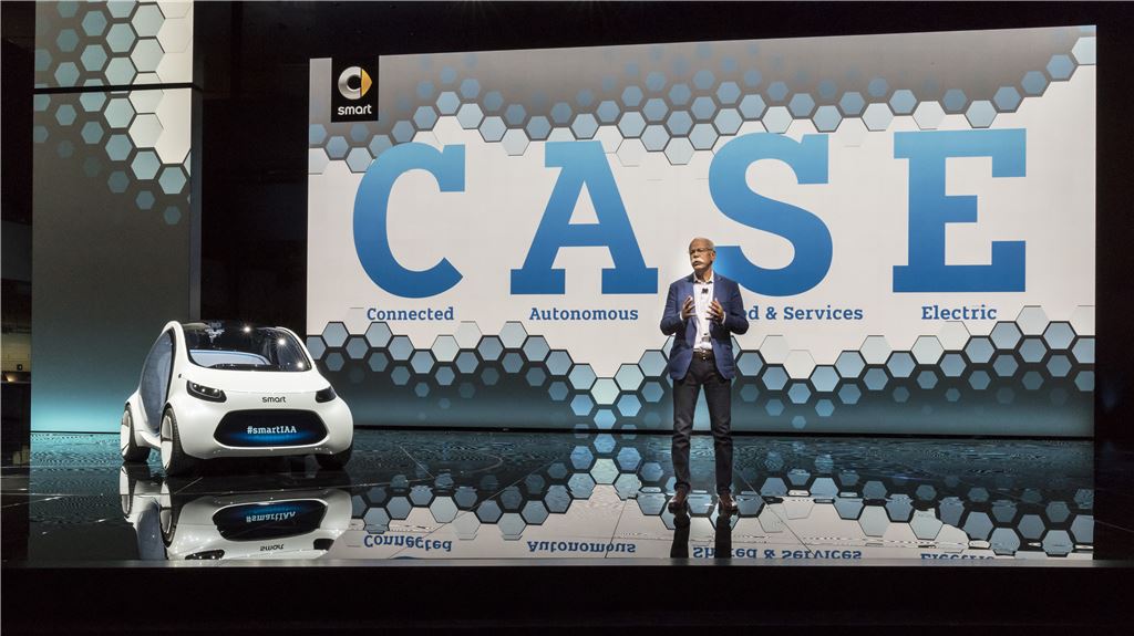 디터 제체 다임러 그룹 회장이 11일(현지시간) 프랑크푸르트 모터쇼 전야 행사로 열린 '메르세데스-벤츠 미디어 나이트'에서 '스마트 비전 EQ 포투'를 소개하고 있다.