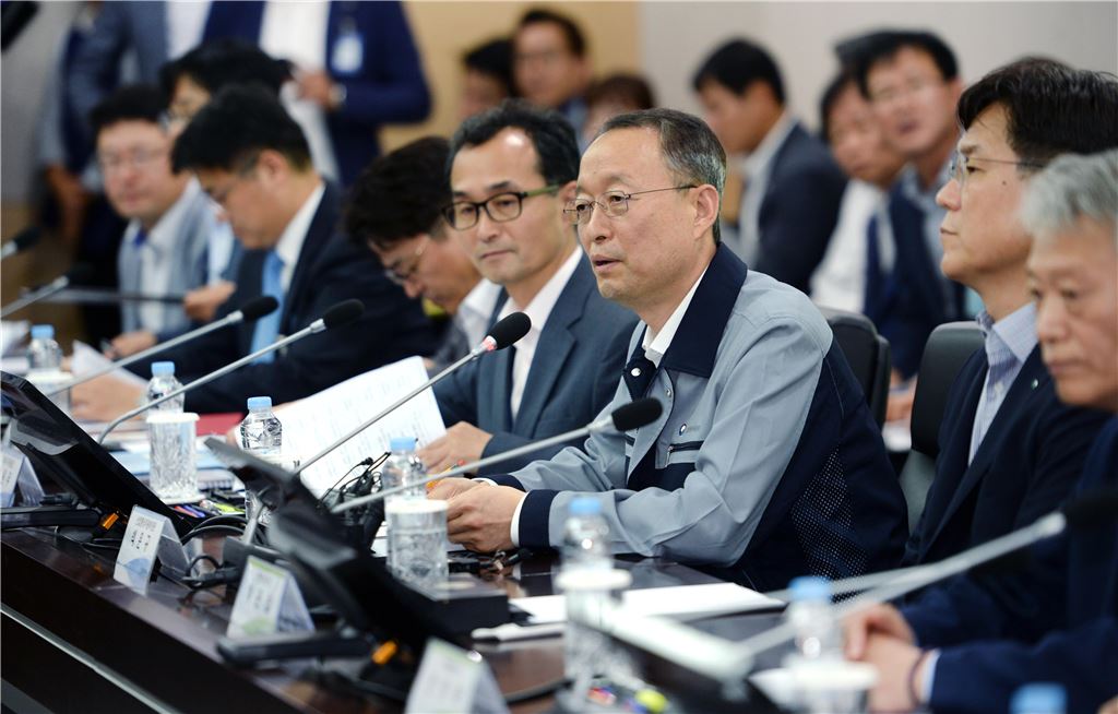 백운규 산업통상자원부 장관(오른쪽 세번째)이 12일 한국수력원자력 월성발전본부 회의실에서 원전 지역주민 간담회를 갖고 "과거 정부가 약속을 이행하지 않은 것에 대해 유감"이라며 "향후 재공론화를 통해 주민의견을 충분히 수렴해 추진하겠다"고 밝혔다. 백 장관이 사용후핵연료 반출요구 등 지역주민들의 의견을 청취하고 있다 .