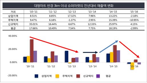 또 대형마트 출점 이후 전통시장 고객은 오히려 늘어난 것으로 조사됐다. 대형마트 출점 이후 전통시장 전년도 고객을 100명으로 볼 때, 전통시장 고객 4.91명이 대형마트로 이동하지만 대형마트를 이용하면서 신규로 전통시장을 이용하는 고객이 14.56명으로 오히려 전통시장에 신규 고객 유입 효과가 컸다. 대형마트와 전통시장을 동시에 이용하는 고객이 출점 후 1년이 지난 시점에는 25.55명에서 출점 후 3년이 되는 시점에서는 39.15명으로 동시 이용 고객이 지속적으로 증가하는 것으로 나타났다. 아울러 대형마트 의무휴업 초기에는 대형마트 매출이 감소한 반면, 전통시장이나 개인 슈퍼마켓의 매출이 증가했지만, 시간이 지남에 따라 전통시장이나 개인 슈퍼마켓의 성장률은 계속 감소했다. 이는 해당 상권에서 소비위축으로 이어진다는 것을 반증한다. 대형마트 반경 3㎞ 이내 슈퍼마켓의 전년대비 성장률을 살펴본 결과 2011년에는 17.66%였으나, 2012년에는 10.49%, 2013년에는 7.54%로 지속 감소하다 식자재마트가 증가한 2015년에는 18.19%로 잠시 상승했다. 하지만 지난해 -2.99% 등로 역신장하여 계속 감소하는 추세를 보였다. 편의점역시 의무휴업 규제 전인 2011년에는 47.24%, 규제가 시작된 2012년에는 38.08%, 2013년에는 2014년에는 24.67%로 가장 먼저 영향을 받았다. 편의점은 유동인구가 많은 지역에서 매출액이 상승하기 때문에 편의점의 성장률 감소는 상권의 침체를 의미한다는 설명이다. 서 교수는 "의무휴업일은 득과 실이 있으나, 장기적으로 오프라인 매장에 대한 소비 축소는 농민 및 납품업체의 매출 저하를 가져오기 때문에 이해관계자의 의견을 반영한 규제에 대한 검토가 필요하다"면서 "새로운 시각에서의 대형마트 및 SSM과 중소상인의 상생 방안에 대한 검토가 필요하다"고 강조했다. 그는 "오프라인에서의 소비위축 현상을 방지하기 위해서는 대형마트 및 SSM의 휴일 규제보다는 중소상인의 경쟁력 강화 및 오프라인 상권의 경쟁력 강화를 위한 공동의 노력 필요하다"고 말했다.이번 연구는 2010년부터 올해까지 한국유통학회가 신용카드 데이터를 활용해 전수조사 방식으로 진행한 만큼 규제로 인해 실제 소비자가 어떻게 움직였는지를 실증적으로 파악, 객관성 및 신뢰성이 다른 어떤 연구보다 높다는 것이 서 교수 측 설명이다. 지연진 기자 gyj@asiae.co.kr<ⓒ세계를 보는 창 경제를 보는 눈, 아시아경제(www.asiae.co.kr) 무단전재 배포금지>