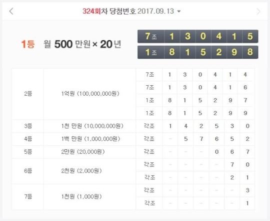 제324회 연금복권 1등 당첨번호가 공개됐다.13일 추첨한 제324회 '연금복권 520'의 1등 당첨번호는 '1조815298'과 '7조130415'번이다.1등 당첨자에게는 20년간 매달 500만원씩 당첨금이 나누어 지급된다. 실 수령액은 세금 22%를 뗀 390만원 정도다.2등 당첨번호는 각 1등 맨 끝자리에 1을 더하고 뺀 총 4개 번호다. 당첨금은 1억원이다.3등 당첨번호는 각조 142530, 4등 당첨번호는 각조에서 뒷자리 숫자 5개가 57652인 번호다. 3등 당첨금은 1000만원, 4등 당첨금은 100만원이다.5등 당첨번호는 각조 뒷자리 숫자 3개가 067, 6등 당첨번호는 각조 뒷자리 숫자 2개가 21과 70이다. 7등 당첨번호는 각조 맨 마지막 자리가 1과 3이다.5등 당첨금은 2만원, 6등과 7등 당첨금은 각각 2000원과 1000원이다미디어이슈팀 기자 <ⓒ세계를 보는 창 경제를 보는 눈, 아시아경제(www.asiae.co.kr) 무단전재 배포금지>
