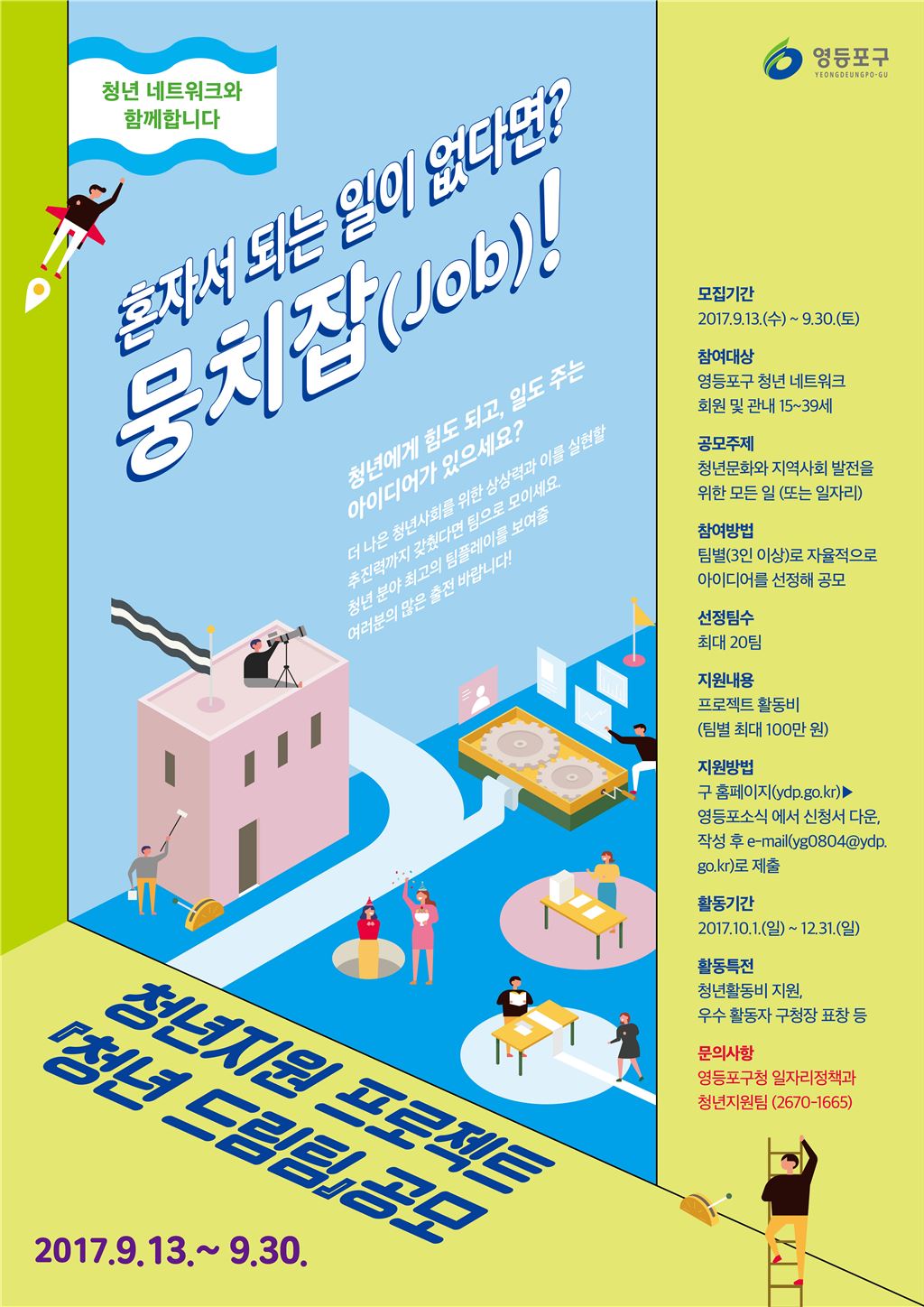 공모팀 PT발표와 투표를 거쳐 최종 20개 팀이 선정되며 선정된 팀은 영등포구 청년 네트워크에 소속돼 10월부터 12월 말까지 팀별 프로젝트를 진행하게 될 예정이다.팀은 월 1회 모임 활동을 지속적으로 운영하면서 11월에 있을 중간상황 발표회와 프로젝트 종료 시 성과발표회에 참가하게 된다.구는 청년 드림팀이 청년사회 발전을 위한 다양한 아이디어를 실험하고 실현할 수 있는 무대가 될 것으로 기대하고 있다. 이에 청년 드림팀 활동에 적극적인 지원을 아끼지 않을 계획이다. 팀별 프로젝트 활동비를 최대 100만원까지 지원, 우수 활동자에게는 구청장 표창도 수여한다.지원방법은 영등포구청 홈페이지(www.ydp.go.kr)>영등포소식에서 신청서를 다운받아 일자리정책과 담당자에게 메일(yg0804@ydp.go.kr)로 제출하면 된다. 조길형 영등포구청장은 “청년 드림팀 프로젝트가 취업난에 가려져 있던 청년들의 목소리를 듣는데 도움이 될 것으로 기대한다”며 “문제점에서 해결책까지 청년만의 방식으로 고심하고 도전한 결과물로 청년사회에 신선한 에너지를 발산해주길 바란다”고 전했다. 박종일 기자 dream@asiae.co.kr<ⓒ세계를 보는 창 경제를 보는 눈, 아시아경제(www.asiae.co.kr) 무단전재 배포금지>