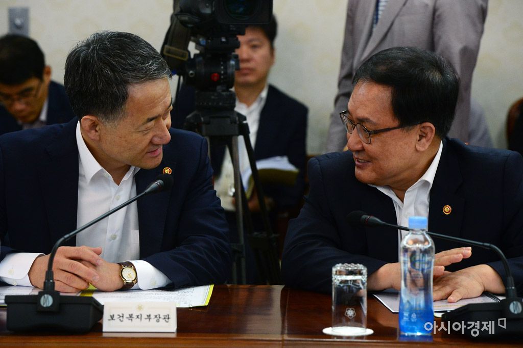 [아시아경제 문호남 기자] 박능후 보건복지부 장관과 유영민 과학기술정보통신부 장관이 14일 서울 세종로 정부서울청사에서 열린 국정현안점검조정회의에 앞서 이야기를 나누고 있다.문호남 기자 munonam@asiae.co.kr<ⓒ세계를 보는 창 경제를 보는 눈, 아시아경제(www.asiae.co.kr) 무단전재 배포금지>