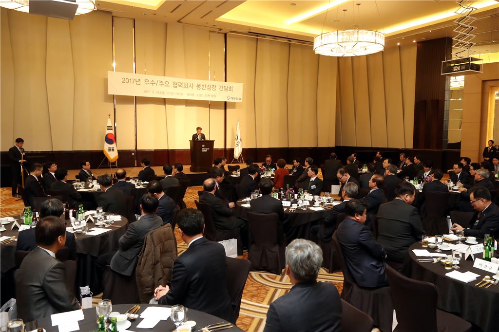 [아시아경제 박혜정 기자]대우건설이 운영 중인 동반성장 프로그램은 '협력사의 성장이 곧 대우건설의 성장'이라는 철학을 바탕으로 한다. 협력사가 자생력을 키우는 데 초점을 두고 교육과 기술, 자금 등에서 실질적인 도움을 준다. 교육 지원 부문의 경우 협력사 대표의 경영 교육과 임직원의 실무능력 강화 교육이 핵심이다. 매년 수차례에 걸쳐 우수·주요 협력사 최고경영자(CEO)를 대상으로 경영전략과 인문, 예술 등 다방면에 걸친 특강을 진행한다. 임직원 대상으로는 한국건설협회에 위탁해 건설현장 원가 관리, 건설산업기본법, 노무 관리, 하도급법 등의 직무능력 향상 교육을 지원한다. 특히 철저한 안전 관리가 동반성장의 최우선 과제라는 판단에 따라 올해는 협력사의 안전 관리에 대한 교육 지원도 강화했다. 지난 2월 서울 신문로 대우건설 본사에서 열린 안전혁신 선포식에 협력사 대표들도 참석해 함께 결의를 다졌다. 기술연구 지원 부문에서는 기술설명회, 공동연구, 공동특허 출원 등을 지원하며 협력사의 기술력을 높여왔다. 대우건설과 협력사가 쌍방향으로 연구 과제를 제안하고 선정된 협력사에 기술 지원, 공동특허 출원, 거래 확대 등의 혜택을 제공하는 '성과공유제'도 좋은 반응을 얻고 있다. 대우건설 관계자는 "교육과 기술 개발 지원에 관심을 갖는 이유는 협력사의 기술경쟁력과 부가가치 등 근원적 경쟁력의 강화를 지원하는 것이 장기적 관점에서 동반성장을 이룰 방법이라고 판단하기 때문"이라고 설명했다.대우건설은 매년 협력사 대표들과 동반성장 간담회를 실시하고 있다. 사진은 지난 2월 열린 '우수·주요 협력사 동반성장 간담회' 모습