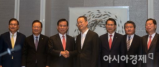 ▲백운규 산업통상자원부 장관과 석유화학사 최고경영자(CEO)가 14일 서울 잠실 롯데월드타워에서 간담회를 갖고 기념촬영을 하고 있다.