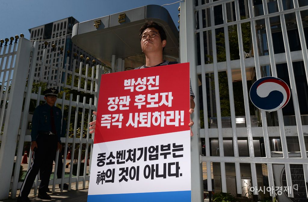 [아시아경제 문호남 기자] 전국 을살리기 국민운동본부 김동규 조직국장이 14일 서울 세종로 정부서울청사 정문 앞에서 박성진 중소벤처기업부 장관 후보자의 자진사퇴를 촉구하며 1인 시위를 하고 있다.문호남 기자 munonam@asiae.co.kr<ⓒ세계를 보는 창 경제를 보는 눈, 아시아경제(www.asiae.co.kr) 무단전재 배포금지>