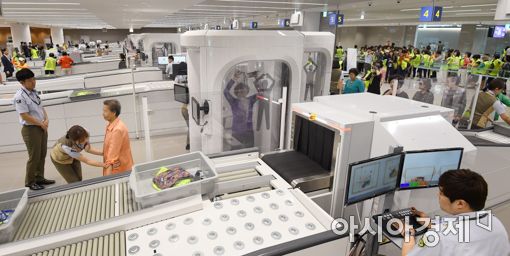 [아시아경제 강진형 기자]14일 오전 정식 개장을 목전에 둔 인천공항 제2여객터미널에서 열린 종합 시험운영 점검에서 가상 여객들이 전신검색대를 통과하고 있다. 전신검색대는 기존의 문형(門形) 금속탐지 검색대로 검색할 수 없는 비금속이나 신체 속에 숨겨둔 물품을 탐지할 수 있는 장비다.강진형 기자 aymsdream@asiae.co.kr<ⓒ세계를 보는 창 경제를 보는 눈, 아시아경제(www.asiae.co.kr) 무단전재 배포금지>