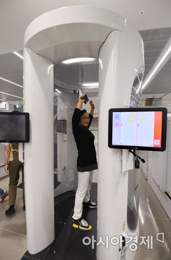 [아시아경제 강진형 기자]14일 오전 정식 개장을 목전에 둔 인천공항 제2여객터미널에서 열린 종합 시험운영 점검에서 가상 여객들이 전신검색대를 통과하고 있다. 전신검색대는 기존의 문형(門形) 금속탐지 검색대로 검색할 수 없는 비금속이나 신체 속에 숨겨둔 물품을 탐지할 수 있는 장비다.강진형 기자 aymsdream@asiae.co.kr<ⓒ세계를 보는 창 경제를 보는 눈, 아시아경제(www.asiae.co.kr) 무단전재 배포금지>