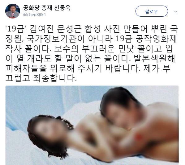공화당 신동욱 총재가 배우 김여진, 문성근의 19금 합성 사진에 대한 자신의 견해를 밝혔다.그는 14일 자신의 트위터에 "'19금' 김여진 문성근 합성 사진 만들어 뿌린 국정원, 국가정보기관이 아니라 19금 공작영화제작사 꼴이다. 보수의 부끄러운 민낯 꼴이고 입이 열 개라도 할 말이 없는 꼴이다. 발본색원해 피해자들을 위로해 주시기 바랍니다. 제가 부끄럽고 죄송합니다"라는 글을 게재해 이목을 집중시켰다.이날 국정원 적폐청산TF와 사정 당국에 따르면 원세훈 전 원장 시절 국정원 심리전단은 2011년 11월 한 보수 성향 인터넷 카페 게시판에 배우 문성근씨와 김여진씨의 모습이 담긴 합성 사진을 게시했다.이는 이명박 정부 시절 국가정보원이 '퇴출 대상'으로 지목된 연예인의 이미지를 실추시키기 위해 합성 나체 사진까지 만들어 인터넷에 살포하는 '특수 공작'에 나선 것으로 드러나 논란을 불러일으켰다.한편 문성근은 이날 자신의 트위터에 "악! 아~ 이 미친 것들. 검찰 조사에 응하겠습니다"라는 글을 게재했다.미디어이슈팀 기자 <ⓒ세계를 보는 창 경제를 보는 눈, 아시아경제(www.asiae.co.kr) 무단전재 배포금지>