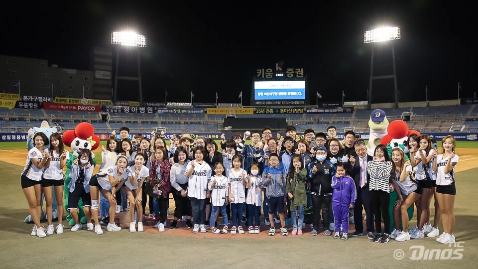[아시아경제 박병희 기자] 프로야구 NC 다이노스가 경남사회복지공동모금회와 함께 정규시즌 종료 시까지 희귀난치성질환 환우들을 위해 모금 행사를 한다.NC는 14일 창원 마산야구장에서 삼성 라이온즈와 치른 홈경기를 '경남 사랑의열매 나눔 D(Dinos)-DAY'로 열고 더불어하나회 부설 꿈사랑학교 학생과 가족, 교사 200명을 초청했다.더불어하나회는 1990년 9월12일부터 직장인들이 모여 '아픈 아이들에게 의미 있고 희망과 용기가 되는 일을 하자'는 뜻을 모아 조직한 단체이다. 2004년 4월 창원시에 꿈사랑학교를 설립해 2006년 교육부의 위탁을 받아 13개 시?도 지역에서 만성질환을 앓고 있는 초?중?고 건강장애학생 및 장기결석학생들에게 화상 강의 등의 학습 기회를 제공하고 있다.NC는 아픈 아이들의 꿈과 희망을 지원하기 위해 경남사회복지공동모금회와 손잡고 이날 시구 및 시타, 애국가 제창, 승리의 하이파이브 등을 함께할 수 있도록 준비했다.이날 시타는 가성장폐색증 치료를 받으며 꿈사랑학교를 다니고 있는 이민혁 학생이 맡았다. NC는 환우들을 위해 홈경기에 스페셜 데이를 진행한 것 외에도 정규시즌 종료 시까지 모금활동을 한다. 모인 기부금은 경남지역 내 희귀난치성질환을 앓고 있는 환우들에게 전달할 예정이다.