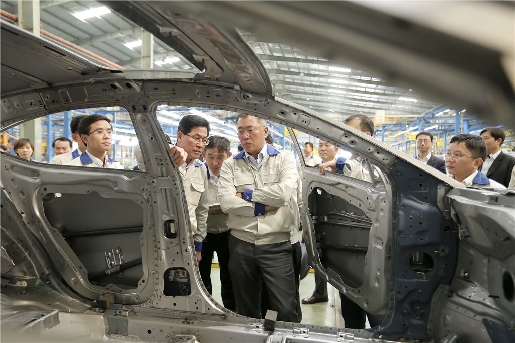 정의선 현대차 부회장(왼쪽)이 지난 3월28일 현대차와 베트남 탄콩그룹 합작사인 현대탄콩 자동차조립공장을 방문해 생산시설을 둘러보고 있다.