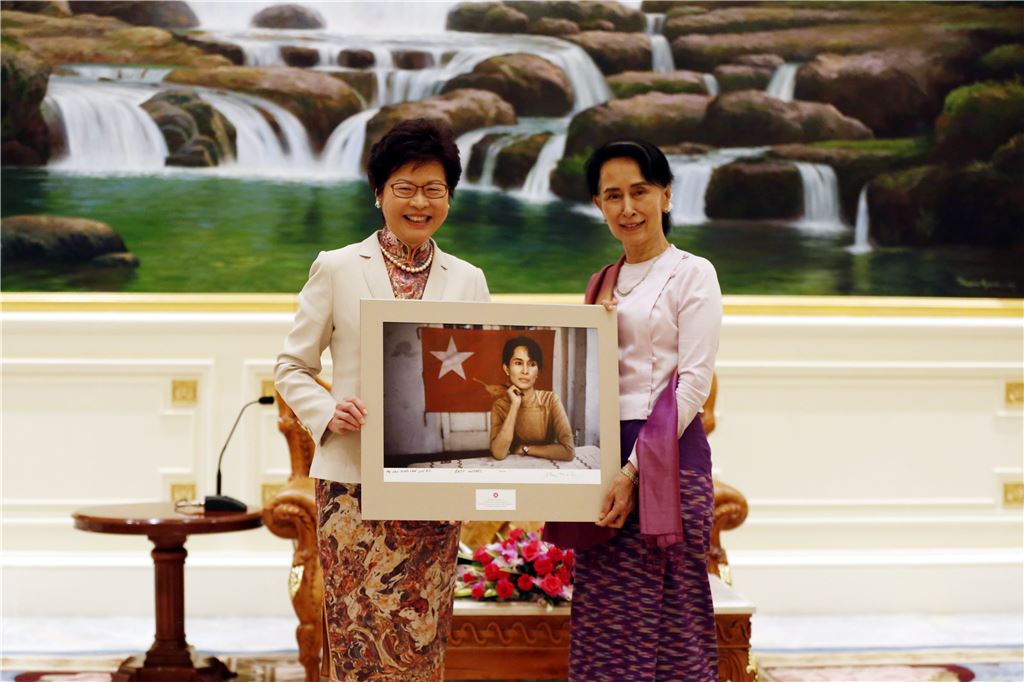 [아시아경제 노미란 기자] 아웅산 수지 여사가 14일(현지시간) 미얀마를 방문한 캐리 람 홍콩 행정장관으로부터 초상화를 선물받고 환하게 웃고 있다. 종교 탄압을 넘어 '인종 청소'로까지 비유되고 있는 로힝야족 탄압에 대해 국제 인권단체들이 수지 여사에게 태도의 변화를 요구하고 있는 가운데 미소 짓는 모습이 대비된다. 미얀마 이슬람 소수족인 로힝야족과 미얀마 정부군 간 유혈사태로 지금까지 1000여명의 사망자가 발생한 것으로 유엔은 집계했다. 노미란 기자 asiaroh@asiae.co.kr<ⓒ세계를 보는 창 경제를 보는 눈, 아시아경제(www.asiae.co.kr) 무단전재 배포금지>