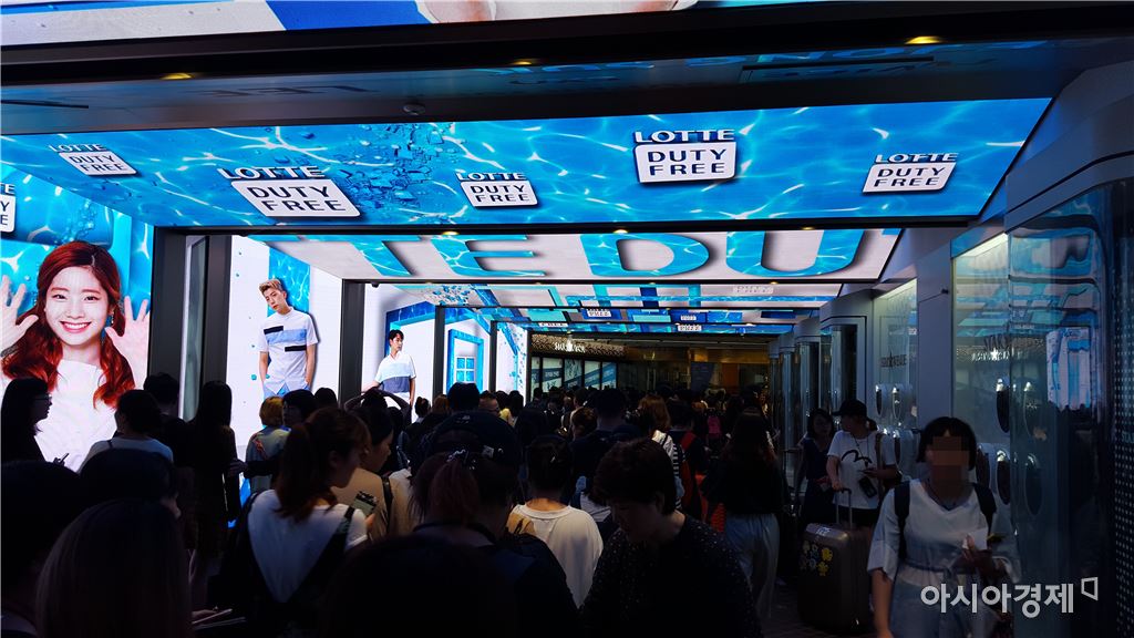 지난달 23일 오전 서울 을지로 롯데면세점 본점에 긴 대기줄이 서 있다. 이들의 대부분은 물건을 전문적으로 구매해 파는 대리판매상들이다.