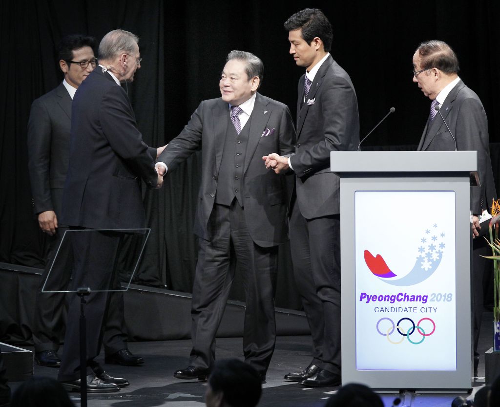 [이미지출처=연합뉴스]이건희 삼성 회장 IOC 위원 사퇴 (서울=연합뉴스) 장현구 기자 = 투병 중인 이건희 삼성 회장이 결국 국제올림픽위원회(IOC) 위원직을 사퇴했다. IOC 집행위원회는 11일 이 회장의 가족에게서 더는 이 회장을 IOC 위원으로 간주하지 말아 달라는 요청을 받았다며 이 회장의 IOC 위원직 사퇴를 공식으로 발표했다.사진은 2011년 7월 6일 남아공 더반 국제컨벤션센터에서 열린 국제올림픽위원회(IOC) 총회에 참석한 이건희 삼성회장이 평창 유치위 프리젠테이션이 끝난 뒤 자크로게 IOC위원장과 악수하는 모습. 2017.8.11 [연합뉴스 자료사진] seephoto@yna.co.kr(끝)[저작권자(c) 연합뉴스, 무단 전재-재배포 금지]