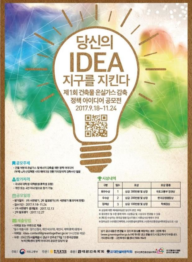 [아시아경제 주상돈 기자] 국토교통부는 대학생들의 도전적이고 창의적인 건축물 온실가스 감축 아이디어를 발굴하여 정책에 반영하고자 '건축물 온실가스 감축 정책 아이디어 공모전'을 연다고 밝혔다. 제안서류는 18일부터 11월24일까지 접수 받는다.이번 공모전의 부제는 '4차 산업혁명시대 패러다임 전환기의 창의적 감축수단 발굴'이다. 사물인터넷(IoT)과 인공지능(AI), 빅데이터 등 4차 산업혁명 시대의 핵심기술 등을 적극 활용한 아이디어를 발굴할 예정이다.국내·외 대학생 및 대학원생이면 개인 또는 팀 단위로 누구나 참가할 수 있다. 참가방법은 녹색건축포털 그린투게더(www.greentogether.go.kr)에 게시된 안내문을 참고하여 제안서 등을 11월24일까지 이메일이나 우편으로 제출하면 된다.제출된 아이디어는 실현가능성과 기대효과, 정책기여도, 창의성 관점에서 1차 서면평가, 2차 발표평가를 통해 심사해 최종 수상작을 선정, 12월 말에 발표할 계획이다.최우수상 1명(팀)에게는 상금 300만원과 국토부 장관상, 우수상 2명(팀)에게는 상금 200만원과 한국감정원장상, 장려상 3명(팀)에게는 상금 100만원과 상장이 수여된다. 수상자는 감정원 입사를 지원할 경우 서류 심사단계에서 우대할 예정이다.공모전 참가방법이나 작성양식 등 자세한 내용은 녹색건축포털 그린투게더에 안내돼 있다. 그린투게더 콜센터(1588-9849)를 통해 추가 궁금한 사항을 문의할 수 있다.국토부 관계자는 "이번 공모전을 통해 신기후체제 출범에 따른 국가 온실가스 감축목표 달성에 기여할 수 있는 4차 산업혁명의 다양한 기술과 접목된 대학생들의 기발한 아이디어 발굴을 기대하고 있다"며 "이와 관련한 관심이 국민 전체로 확대되기를 바란다"고 말했다.주상돈 기자 don@asiae.co.kr<ⓒ세계를 보는 창 경제를 보는 눈, 아시아경제(www.asiae.co.kr) 무단전재 배포금지>