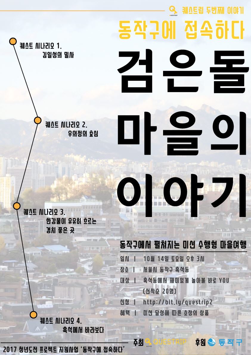 미션은 ▲김일성의 밀사 ▲우의정의 효심 ▲한강물이 유유히 흐르는 경치 좋은 곳 ▲흑석에서 바라보다 등이다. 단계별로 여러 단서를 따라 문제를 해결하다 보면 흑석동 골목 구석구석에 숨어있는 이야기를 만나게 된다. 마을 이야기가 청년들을 만나 문화 콘텐츠로 재탄생하는 것이다. 가이드를 따라가는 방식이 아닌 참여자 스스로 동네 곳곳을 돌아다니며 여행을 즐기도록 구성했다. 미션 달성 후에는 상품도 기다리고 있다. 선착순 20명을 모집하며 웹사이트(bit.ly/questrip2)에서 누구나 신청 가능하다. 김연순 일자리경제담당관은 “마을안에 숨겨진 보석같은 이야기들을 청년들의 즐길거리로 만들었다”며 “빠른 변화에 익숙한 청년들에게 느린 걸음으로 마을을 돌아다니는 이 여행은 색다른 경험이 될 것”이라고 말했다. 박종일 기자 dream@asiae.co.kr<ⓒ세계를 보는 창 경제를 보는 눈, 아시아경제(www.asiae.co.kr) 무단전재 배포금지>