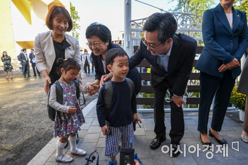 [아시아경제 강진형 기자]김동연(오른쪽) 경제부총리 겸 기획재정부 장관과 정현백(오른쪽 두 번째) 여성가족부 장관이 18일 오전 서울 구로구 사랑채움어린이집을 방문해 등원하는 어린이들을 맞이하고 있다.강진형 기자 aymsdream@asiae.co.kr<ⓒ세계를 보는 창 경제를 보는 눈, 아시아경제(www.asiae.co.kr) 무단전재 배포금지>