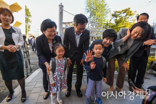 [아시아경제 강진형 기자]김동연(왼쪽 세 번째) 경제부총리 겸 기획재정부 장관과 정현백(왼쪽 두 번째) 여성가족부 장관, 김영주(왼쪽 네 번째) 고용노동부 장관이 18일 오전 서울 구로구 사랑채움어린이집을 방문해 등원하는 어린이들을 맞이하고 있다.강진형 기자 aymsdream@asiae.co.kr<ⓒ세계를 보는 창 경제를 보는 눈, 아시아경제(www.asiae.co.kr) 무단전재 배포금지>