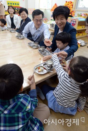 [아시아경제 강진형 기자]김동연 경제부총리 겸 기획재정부 장관, 김영주 고용노동부 장관, 정현백 여성가족부 장관이 18일 오전 '저출산 대응과 여성 경제활동 참여 확대를 위한 관계 부처 합동 현장방문 차 서울 구로구청 내 어린이집을 방문해 일일보조보육교사 활동을 하고 있다.강진형 기자 aymsdream@asiae.co.kr<ⓒ세계를 보는 창 경제를 보는 눈, 아시아경제(www.asiae.co.kr) 무단전재 배포금지>