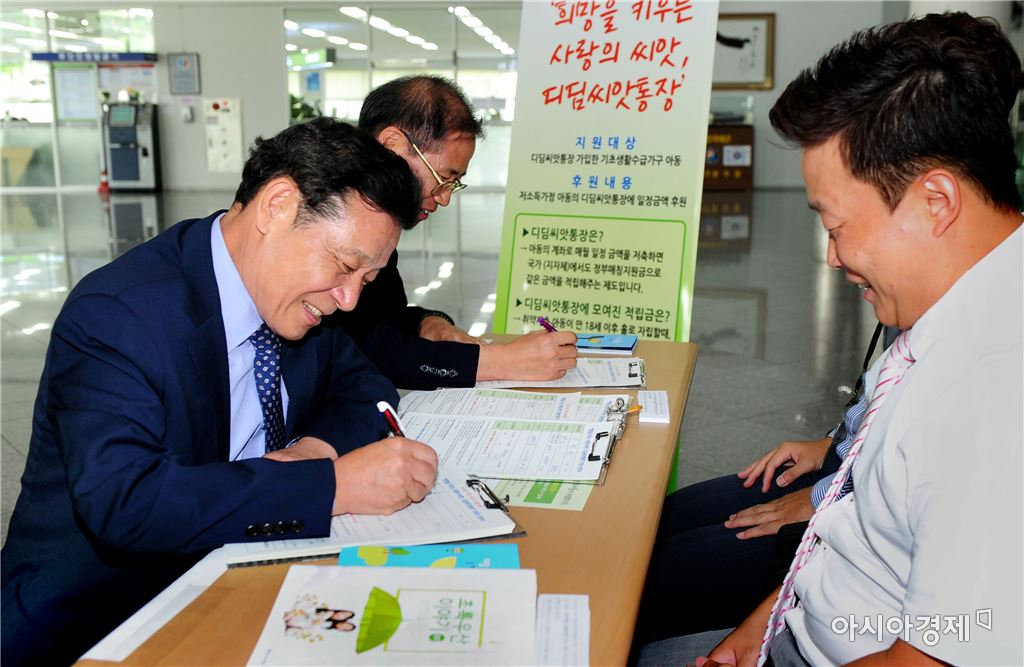 [아시아경제 노해섭 기자]윤장현 광주광역시장이 18일 오후 시청 시민숲에 마련된 ‘디딤씨앗 통장사업 홍보부스’를 방문해 저소득 가정아동 디딤씨앗 통장 후원 신청서를 작성 하고 있다. / 광주광역시 제공<ⓒ세계를 보는 창 경제를 보는 눈, 아시아경제(www.asiae.co.kr) 무단전재 배포금지>