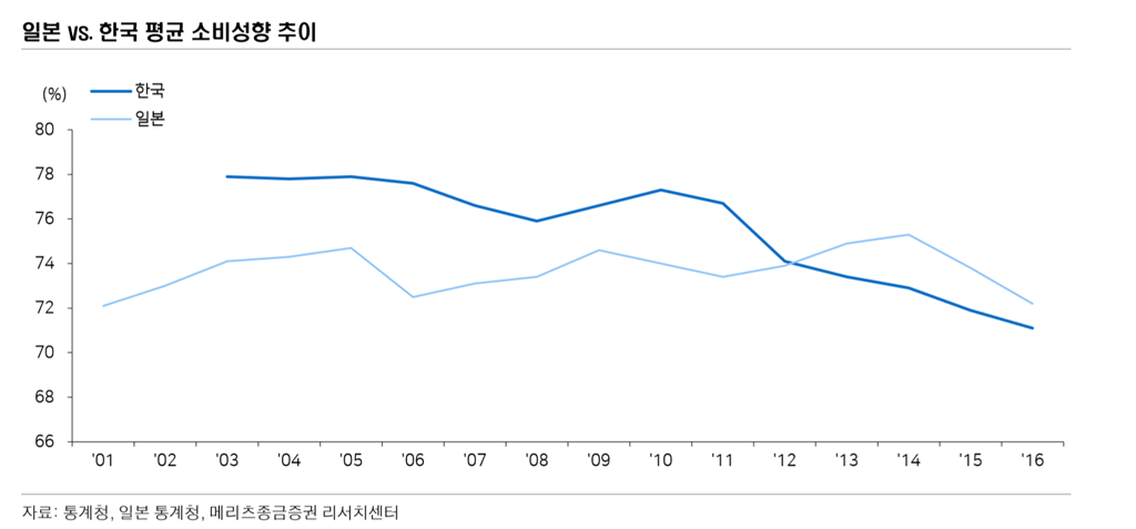 [아시아경제 지연진 기자]일본 경제는 1990년대 중반 이후 자신감 상실에 따른 심리적 위축현상이 뚜렸해졌다. 불황에 따른 저성장이 계속되면서 각 경제주체는 경제성장에 대한 믿음을 상실했고, 실제 성장율도 하락하는 '이력효과(어떤 물체가 외부 힘에 의해 영향을 받은 후 본래 상태로 쉽게 돌아가지 못하는 현상)'가 나타났다. 18일 양지혜 메르츠종금증권 애널리스트는 "아직 한국은 일본과 같은 자산가격 하락에 따른 대차대조표 불황이 현실화되고 있지는 않지만 일본의 잃어버린 20년을 초래했던 다양한 경제 현상들이 상당 부분 한국에서도 나타나기 시작했다"고 지적했다. 양 애널리스트가 이날 펴낸 보고서를 보면 한국과 일본의 가장 비슷한 점은 '인구 고령화'다. 특히 한국의 출산율 하락세는 주요 선진국에 비해 훨씬 빠르게 진행되면서 고령화 속도는 일본보다 가파르다. 지난해 한국의 생산가능인구는 감소세로 돌아섰다. 일본의 경우 65세 이상 고령인구 비중은 1990년 12.1%에서 지난해 23%로 20년간 연평균 0.5%포인트 높아졌다. 반면 한국은 아직 고령인구 비중은 2013년 12.2%로 일본의 1990년 수준이다. 하지만 이같은 속도로 고령화가 진행될 경우 2033년 고령인구 비중은 26.7%로 일본보다 높을 전망이다. 가계의 소비가 위축되는 점도 비슷하다. 일본 가계의 평균 소비성향은 1981년 79.2%였으나 1990년에는 75.3%로 떨어졌고 1998년에는 71.3%까지 하락했다. 경제성장률이 급락하고 불안심리가 확산된데 따른 것이다. 우리나라의 경우 가계 평균 소비성향이 2010년 77.3%에서 2015년 72%까지 하락하였으며 2011년 이후 일본에 비해 소비성향이 떨어지는 속도가 더 가파르게 나타나고 있다. 디플레이션도 마찬가지다. 아베 신조 일본 총리는 2012년 취임 직후부터 디플레이션 탈출을 역점 과제로 꼽았지만 현재까지 디플레이션이 반복되고 있다. 우리나라는 2015년 소비자물가상승률이 0.5%에서 올해 2% 수준으로 회복했지만, 가격변동성이 큰 신선식품 가격이 급등한데 따른 일시적인 현상이다. 양 애널리스트는 "실질적인 수요 회복이 뒷받침되지 않는다면 잠재 경제성장률 하락과 함께 저물가 기조가 이어질 전망"이라고 내다봤다. 이 밖에도 일본의 장기침체 당시 혼자사는 가구가 늘어나면서 편의점에서 간편하게 식사를 해결하는 라이프 트랜드가 확산된 마찬가지로, 최근 우리나라도 출산 및 양육에 대한 부담으로 결혼을 포기하는 경향이 늘어난 점도 공통점이다. 일본 유통업계는 저성장의 탈출구를 '기본'에서 찾았다. 유통업게에선 중심상권이 가장 중요한 만큼 중심상권을 중심으로 영업을 확대했다. 일본에서 인구가 늘어나는 것은 도시권으로 수도인 도쿄 인근에 집중됐다. 유통업체 실적에서 핵심상권 점포에서 매출은 70% 이상이다. 양 애널리스트는 "위성도시는 본전 유지 정도이고, 외각 지역의 대형 쇼핑몰의 경우 화려해 보이지만 고전하고 있다"면서 "도심상권의 편리한 입지조건은 관광객들의 인바운드 수요에도 긍정적"이라고 평가했다. 또 일본의 장기 불황과 디플레이션 속에서도 가격할인보다 품질 향상에 방점을 찍은 유통기업들이 시장 입지를 강화했다. 일본의 백화점 업계는 아울렛 사업은 진출하지 않았다. 백화점은 고품질의 좋은 상품을 판매한다는 본질을 훼손시키지 않으려고 했고, 일본 선드럭 또한 PB상품 비중은 6~7% 정도에 불과하다. 평균 가격이 낮아질 수도 있기 때문에 그 비중을 10% 이상 높이고 있지 않고있다. 여기에 일본에선 양적 성장을 위한 M&A보다는 산업 구조조정 관점에서 M&A 활성화됐다. 그 결과 우수한 현금 창출력과 풍부한 자금을 보유한 유통업체들 중심으로 산업 재편되고 있다. 지연진 기자 gyj@asiae.co.kr<ⓒ세계를 보는 창 경제를 보는 눈, 아시아경제(www.asiae.co.kr) 무단전재 배포금지>