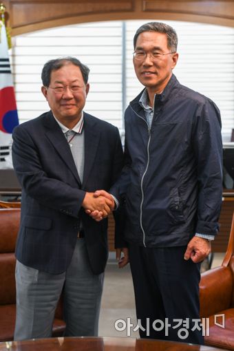 [아시아경제 강진형 기자]박병원(왼쪽) 한국경영자총협회 회장과 김주영 한국노총 위원장이 18일 오후 서울 마포구 경총회관에서 면담에 앞서 악수하고 있다.강진형 기자 aymsdream@asiae.co.kr<ⓒ세계를 보는 창 경제를 보는 눈, 아시아경제(www.asiae.co.kr) 무단전재 배포금지>