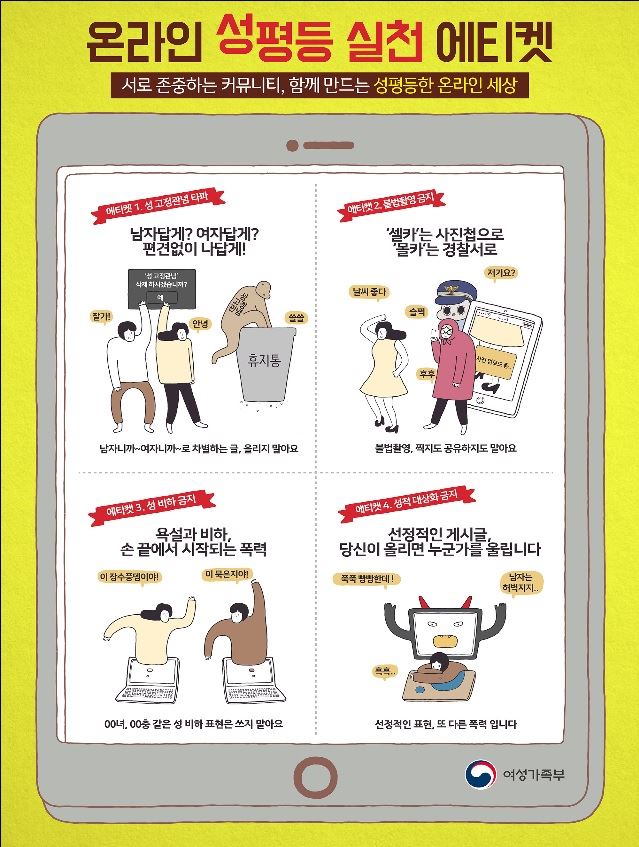 [아시아경제 이현주 기자] 여성가족부는 생활 속 성평등 의식을 높이기 위한 '온라인 성평등 실천 에티켓 캠페인'을 전개한다고 19일 밝혔다.'서로 존중하는 커뮤니티, 함께 만드는 성 평등한 온라인 세상'을 주제로 한 웹 포스터, 아이들이 성별에 대한 편견 없이 성장하도록 일상 속 성평등 의식을 높이자는 내용의 웹툰 등이 대표적이다.웹포스터는 4가지 실천 에티켓(▲성 고정관념 타파 ▲불법촬영 금지 ▲성비하 금지 ▲성적 대상화 금지)을 담아 온라인상에서 무심결에 행해지는 성차별적 언어와 행동들에 대해 다시 한 번 생각해 보는 기회를 제공한다. 웹툰 캠페인 '성평등, 보는 만큼 본받습니다'는 어른들의 성역할 고정 관념을 우리 아이들에게도 그대로 물려줄 것인가라는 질문을 던진다.웹툰의 마지막 한 컷을 '우리 아이에게 전하는 성평등 의식이 담긴 한 마디'로 제안하는 '성평등 실천 에티켓 한 줄 댓글 이벤트'로 연계해 국민들이 자연스럽게 공모에 참여할 수 있도록 했다. 공모전은 다음달 9일까지 '여성가족부 가족사랑 페이스북'을 통해 진행되며, 심사를 통해 1등 1명(액션캠) 등 100여 명에게 부상이 주어진다. 수상작은 웹툰 마지막 컷에 반영돼 동영상 등으로도 제작되며, 포털 및 SNS 광고, 은행·대형마트·관공서 등에서 확산될 예정이다. 이현주 기자 ecolhj@asiae.co.kr<ⓒ세계를 보는 창 경제를 보는 눈, 아시아경제(www.asiae.co.kr) 무단전재 배포금지>
