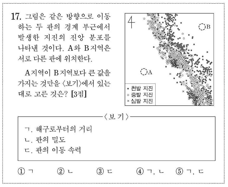 [아시아경제 조인경 기자] 지난 6일 치러진 2018학년도 대학수학능력시험 모의평가에서 과학탐구영역 지구과학Ⅰ 17번 문항의 복수정답이 인정됐다. 직업탐구영역에서는 기초제도 18번의 정답이 변경됐다.한국교육과정평가원은 수능 9월 모의평가가 시행 이후 9일까지 홈페이지를 통해 이의신청을 접수·검토한 결과 이같이 결정했다고 18일 밝혔다.지구과학Ⅰ 17번은 판(plate)의 경계 부근에서 발생하는 지진 자료를 바탕으로 인근 지형과 판의 특징을 분석하는 문제다.두 판이 정확히 어느 방향으로 이동하는지는 문제에서 알 수 없는데, 이동 방향이 남서쪽이냐 북동쪽이냐에 따라 보기에 대한 판단이 달라질 수 있어 기존 정답인 ①번 외에 ⑤번도 정답으로 인정한다고 평가원은 밝혔다. 문제에는 두 판이 '같은 방향'으로 이동한다고만 돼 있다.자문을 맡은 대한지질학회의 경우 정답을 2개로 인정하는 게 타당하다고 밝혔고, 한국지구학회는 이론적으로 판단이 어렵다고 분석했다.