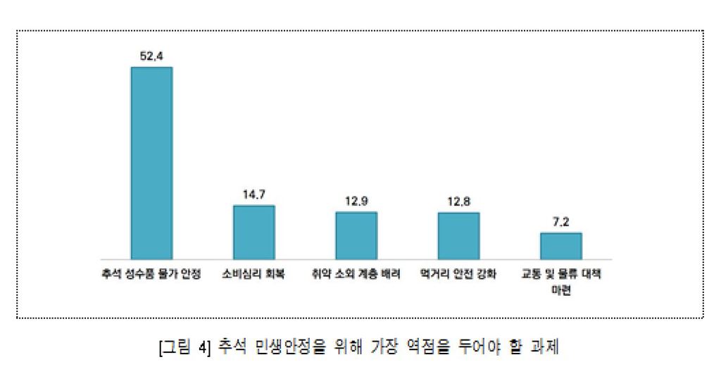 [아시아경제 금보령 기자] 서울시민들이 바라는 추석 민생안정 대책 1순위는 '추석 성수품 물가 안정'으로 나타났다.19일 서울연구원이 발표한 '2017년 3분기 서울시 소비자 체감경기와 추석경기 진단'에 따르면 추석 민생안정을 위해 성수품 물가가 안정되길 바라는 응답자는 52.4%로 가장 많았다.이어 '소비심리회복'(14.7%), '취약 소외계층 배려'(12.9%), '먹거리 안전 강화'(12.8%), '교통 및 물류 대책 마련'(7.2%) 순이었다.추석을 준비하면서 가장 부담되는 비용은 '가족 및 친·인척 용돈'이 45.2%로 1위를 차지했다. 그 다음 '추석 상차림비'(28.9%), '명절 선물비'(21.5%) 등이었다. 추석에 쓸 예상금액으로는 '20만~50만원 미만'이 41.3%로 가장 높은 비율을 차지했다.추석 상차림에 필요한 물건은 '대형마트'에서 산다는 응답이 49.9%였다. '전통시장'은 38.5%, '농협·수협·축협'은 4.2%로 조사됐다.서울시민의 체감경기는 2분기 연속 증가세가 지속됐다. '소비자태도지수'는 올해 3분기 102.3으로 전 분기 대비 0.2포인트 올랐다. 서울연구원 관계자는 "소비자태도지수가 2분기 연속 기준치 100을 상회하면서 새 정부 출범에 따른 정책 기대심리가 아직 일정 수준 유지되고 있는 것으로 판단된다"고 설명했다. 소비자태도지수의 구성요소인 '현재생활형편지수'도 전 분기 대비 1.1포인트 상승하면서 86.1을 기록했다.반면 '미래생활형편지수'는 전 분기보다 5.4포인트 하락한 98.3으로 나타났다. 향후 가계소득 감소, 물가 상승, 지출비용 증가 등의 이유로 1년 후에는 가구 생활형편이 더 안 좋아질 것으로 생각하는 가구가 늘어서다.'내구재구입태도지수'는 전 분기보다 0.5포인트 오른 91.7을 나타냈고, '주택구입태도지수'는 전 분기보다 7.3포인트 떨어진 67.5를 보였다. 서울연구원 관계자는 "'8.2 부동산 대책'에 따른 규제 강화 등으로 주택시장 전망이 불투명해지면서 현재 주택을 구입하는 것에 보수적인 사람들이 늘었다"고 말했다.금보령 기자 gold@asiae.co.kr<ⓒ세계를 보는 창 경제를 보는 눈, 아시아경제(www.asiae.co.kr) 무단전재 배포금지>