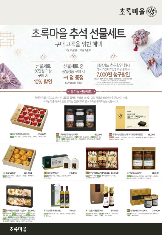 [아시아경제 이선애 기자] 초록마을은 민족 고유의 명절 추석을 맞아 추석 선물세트 판매를 다음달 3일까지 진행한다고 19일 밝혔다. 초록마을 추석 선물세트 판매는 전국 480여개 매장과 온라인쇼핑몰, 모바일 앱에서 진행한다. 초록마을 추석선물 세트는 품질과 실속을 모두 갖춘 추석 선물세트를 기획했고 특히 유기농 선물세트를 더욱 알차게 준비했다. 대표적인 유기인증 선물세트로는 유기농혼합과일세트(사과?배, 9만원), 유기홍삼순액100(80㎖X30포, 11만원), 유기수산인증신안바다재래김세트(혼합, 4만2000원), 유기농흑화고혼합세트(2호)(흑화고1입, 건표고절편2입, 5만5000원) 등이 있다. 추가로 알뜰한 고객님을 만족시킬 수 있는 2~4만원대의 실속형 선물세트를 확대했다. 주요 선물세트로는 국내산 쌀 조청으로 만든 전통한과인 고향생각(2만5000원), 과일액상차세트(2호, 3만30000원), 남해바다멸치세트(실속3종, 3만9000원), 초록햄세트(2호, 4만9800원) 등이 있다. 초록마을은 추석 선물세트 판매 기간 동안 상품증정, 청구할인 등의 프로모션을 진행한다. 초록마을 선물세트를 50만원 이상 구매 시 10% 할인한다. 또한 삼성카드로 15만원 이상 누적결제 시에는 7000원의 청구할인을 제공한다. 이선애 기자 lsa@asiae.co.kr<ⓒ세계를 보는 창 경제를 보는 눈, 아시아경제(www.asiae.co.kr) 무단전재 배포금지>