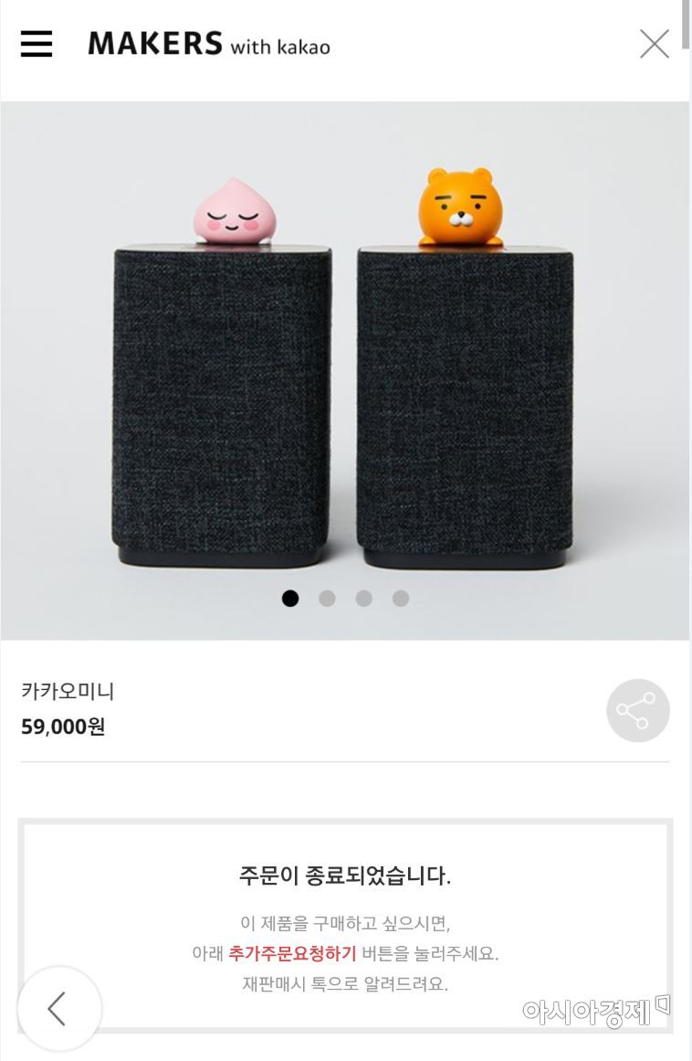 [아시아경제 한진주 기자] 카카오와 네이버가 인공지능(AI) 스피커 프로모션 경쟁을 펼치면서 시장이 뜨거워지고 있다. 카카오의 '카카오미니'는 판매 수십분만에 완판을 기록했고, 네이버의 '웨이브' 역시 예약판매로만 1만대 가까운 물량을 팔아치우는 기염을 토했다.카카오미니는 18일 모바일 주문생산 플랫폼 메이커스를 통한 예약판매에서 준비된 물량 3000대를 완판했다. 예약이 시작된지 38분만이다. 정식 판매가격의 절반인 5만9000원에 내놨고 멜론 1년 이용권(월 100원)을 제공한다는 소식에 소비자의 구매욕구를 자극한 것으로 보인다.예약판매 시간 11시를 전후해 카카오미니를 구입하려는 이용자들이 한꺼번에 몰리면서 30분 넘게 접속장애가 생기기도 했다. 한 소비자는 트위터에 "카카오미니 주문에 실패한 것보다 그것 때문에 날린 오전 시간이 더 아깝다"고 토로하기도 했다. 이에 카카오 관계자는 "카카오미니를 구매하려는 이용자들이 몰릴 것을 대비해 서버 용량을 확충했으나, 예상보다 동시 접속자가 많이 몰려 메이커스 페이지 접속 지연이 발생했다"고 했다. 회사 측도 시장의 뜨거운 반응을 예상하지 못했다는 것이다. 카카오미니 정식판매는 10월말 오프라인 등에서 시작된다. 예약판매 때 접속장애가 있었다는 점에서 정식구입 소비자에게도 특별한 혜택을 제공할 계획이다. 카카오 관계자는 "이용판매처나 판매조건에 대해 다음달 중 공지할 예정이며 정식판매 시점에는 충분한 물량을 확보해 예상치 못한 문제가 발생하지 않도록 하겠다"고 말했다.