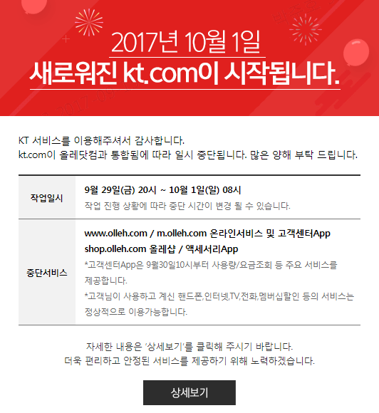 [아시아경제 안하늘 기자]KT가 자사 웹페이지 '올레닷컴'을 'KT닷컴'으로 변경한다. KT는 웹페이지 주소 뿐 아니라 SNS 채널 이름, 스마트폰 통신사 표시 등도 올레에서 KT로 바꾼 바 있다. 19일 KT는 오는 29일 20시부터 다음달 1일 8시까지 올레닷컴을 KT닷컴으로 전환하는 작업을 진행한다고 밝혔다.이에 따라 웹페이지, 모바일 페이지 온라인 서비스 및 고객센터 애플리케이션(앱)을 이용할 수 없다. 또 온라인 쇼핑몰인 올레숍과 액세서리 앱도 사용불가다. 고객센터 앱은 9월30일 10시부터 사용량, 요금조회 등 주요 서비스를 제공한다. 휴대폰, 인터넷, TV, 전화, 멤버십 할인 등의 서비스는 정상적으로 이용가능하다고 KT는 설명했다.올레는 이석채 전임 KT 회장이 2009년 취임하면서 제2의 창업과 함께 올레 경영을 선언한 이후부터 KT의 브랜드명으로 사용됐다. 올레(Olleh)란 헬로(Hello)의 알파벳을 역순한 것으로 '역발상의 혁신적인 사고'를 통한 서비스 제공(역발상 경영) 등을 뜻한다. 이 전 회장은 당시 KTF와의 합병을 추진하면서 통합 KT에 새로운 창업정신이 필요하다는 의견을 채택해 올레경영을 발표했다. 하지만 황창규 회장이 부임한 이후 지난해 2월 서울 광화문 본사 1층에 있는 올레 스퀘어의 명칭을 KT스퀘어로 교체하는 것을 시작으로 이 전회장의 색을 빼기 위한 작업을 꾸준히 해왔다. 공식 웹페이지명까지 바꾸면서 굵직한 사업 부문에 대해서는 브랜드명 교체가 거의 마무리된 것으로 보인다. 이에 대해 KT 관계자는 "글로벌 행보에 맞춰 KT라는 하나의 브랜드로 힘을 실어주는 전략적 작업"이라고 말했다.한편 6년여 만에 브랜드명이 올레에서 KT로 바뀌면서 고객들의 데이터베이스(DB)가 뒤섞이는 문제도 있었다. 특히 웹페이지에서 서비스들이 '올레'와 'KT'가 뒤섞이면서 고객들의 불만이 제기되자, KT는 이를 설명하고자 '올레 던전'이라는 안내 서비스도 소개한 바 있다.안하늘 기자 ahn708@asiae.co.kr<ⓒ세계를 보는 창 경제를 보는 눈, 아시아경제(www.asiae.co.kr) 무단전재 배포금지>
