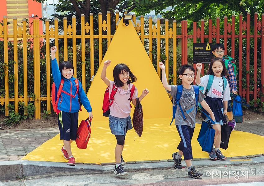 ▲지난 6월 경기 용인 초등학교 학생들이 '옐로카펫'이 설치된 횡단보도를 건너고 있다. (제공=삼성전자)