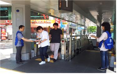 시와 자치구, 시민단체 관계자들이 지하철역 근처에서 금연캠페인을 진행하고 있다.