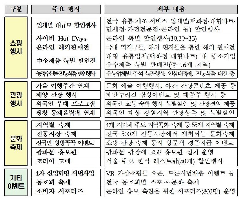 추석연휴와 맞물려 진행되는 만큼, 추석 직거래 장터 239개소를 운영하며, 농·축·수산물 및 전통식품 할인행사도 대폭 강화한다.볼거리를 위해서는 10월21일부터 11월5일까지 가을 여행주간과 연계해 '해안누리길 탐방 이벤트' 및 대종주 행사 등 다양한 관광 프로그램이 마련된다. 명사와 함께하는 아트투어 명소 탐방, 청년 방문단 구성·지원 등 문화·예술 여행 프로그램을 비롯해, 전주 '가을여행 달빛야행' 등 야간 관광콘텐츠, 제주 '삼무(三無)의 밤' 등이 진행된다. 외국인 관광객들에게는 다양한 할인 혜택과 전용 교통카드가 제공된다. 제주 'No1 스트리트페스타', 울산 울주 '봉계 한우불고기 축제', 경기 성남 '코리아세일페스타 인 모란', 광주 '쇼핑의 나라 충장랜드' 등 4개 지역을 포함해 전국 곳곳에서 55개의 지역 특화 축제도 개최된다. 이 외에도 서울 주요 한식 레스토랑 50곳에서는 특별메뉴를 저렴하게 제공하는 '코리아 고메' 행사도 열린다. 이번 코리아세일페스타에서는 소상공인·중소기업의 역할을 확대하고, 대기업과 중소기업 간의 상생협력을 더욱 강화한다.전통시장 행사의 경우 참여 시장 수를 지난해 405개에서 올해 500개 이상으로 대폭 확대하고, 할인행사 중심의 행사에서 관광·문화와 연계한 국민 참여형 행사로 전환한다. 개최 시기도 대형 유통업체의 집중 할인행사 시기와 분리해 10월 중순 이후에 집중 연다.또 백화점 내 중소기업 우수 제품 특별 판매전을 총 16개 매장에서 실시한다. 아울러 주변 전통시장과의 자매결연을 통해 교육·판촉을 지원하는 등 대형 유통업체별 자율적인 상생 프로그램도 별도로 추진한다.4차 산업혁명 시대를 쉽게 체감할 수 있는 유통 분야의 신기술도 선보인다. 가상현실 속에서 쇼핑 체험 및 상품 구매가 가능한 가상현실(VR) 복합 쇼핑몰을 신규로 구축·운영한다. 여기에는 롯데·현대백화점, 이마트, LG전자, 하이마트 등 총 6개 유통업체가 참여하며, 홍대·인사동 등 유명거리, 동대문시장·자갈치시장 등 전통시장에서도 운영된다.아울러 올해는 중국인 관광객 감소에 대비해 외국인 관광객 유치 국가를 다변화하기 위해 노력 중이다. 한국관광공사, 해외문화홍보원, 코트라 등 해외 네트워크를 활용해 동남아·중동·러시아·일본 등 신흥국 중심의 홍보를 대폭 강화했고, 홈페이지 및 홍보자료에도 기존 3개 언어(영어, 일본어, 중국어)외에 베트남어와 인도네시아어 등을 추가했다.백운규 산업부 장관은 "2017 코리아세일페스타가 소상공인·중소기업과 더불어 함께하면서, 양적·질적 차원에서 지난해보다 수준 높은 행사로 만들어 국민들의 행복과 소비 활성화에 기여할 수 있도록 노력하겠다"고 말했다. 세종=이광호 기자 kwang@asiae.co.kr<ⓒ세계를 보는 창 경제를 보는 눈, 아시아경제(www.asiae.co.kr) 무단전재 배포금지>