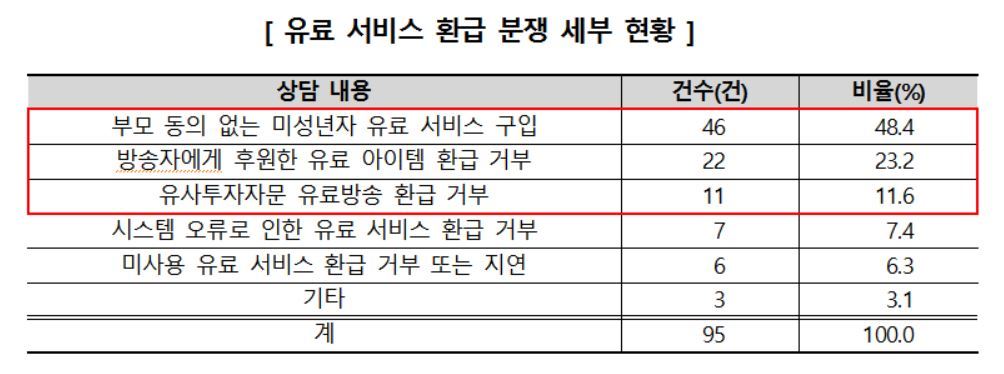 최근 3년 6개월간 소비자상담센터를 통해 접수된 1인 미디어 관련 소비자 불만상담 분석 결과에 따르면 ‘유료 서비스 환급 분쟁’이 95건(62.5%)으로 가장 많았다. 다음으로 ‘일방적인 서비스 이용제한’ 19건(12.5%), ‘부당결제’ 11건(7.3%), '서비스 불만‘ 9건(5.9%), ‘불법방송’ 9건(5.9%) 등의 순으로 조사됐다.특히 ‘유료 서비스 환급 분쟁’의 경우 ‘미성년 자녀가 부모 동의 없이 구입’한 경우가 46건(48.4%)으로 절반에 이르렀다. 금액은 최소 8만5000원에서 최대 2500만원에 이르는 것으로 분석됐다. 유료 서비스는 사실상 구매한도에 제한이 없기 때문에 미성년 자녀의 무단사용 피해예방을 위해서는 휴대폰과 신용카드 등에 대한 관리가 필요하다. 소비자원은 이번 조사결과를 바탕으로 소비자 오인가능성 있는 유료 서비스 관련 안내문구 개선, 상품구매 페이지에 거래제한 사항(청약철회 불가 등) 표시 강화, 유료 서비스 등에 대해 중도해지 및 환급이 가능하도록 불합리한 거래조건 개선, 콘텐츠 업로드 시 연령제한 콘텐츠 여부 필수선택(현재는 임의선택) 및 미인증 시 성인콘텐츠 목록 노출 금지 등의 개선방안을 관련 기관에 건의했다. 나주석 기자 gonggam@asiae.co.kr<ⓒ세계를 보는 창 경제를 보는 눈, 아시아경제(www.asiae.co.kr) 무단전재 배포금지>