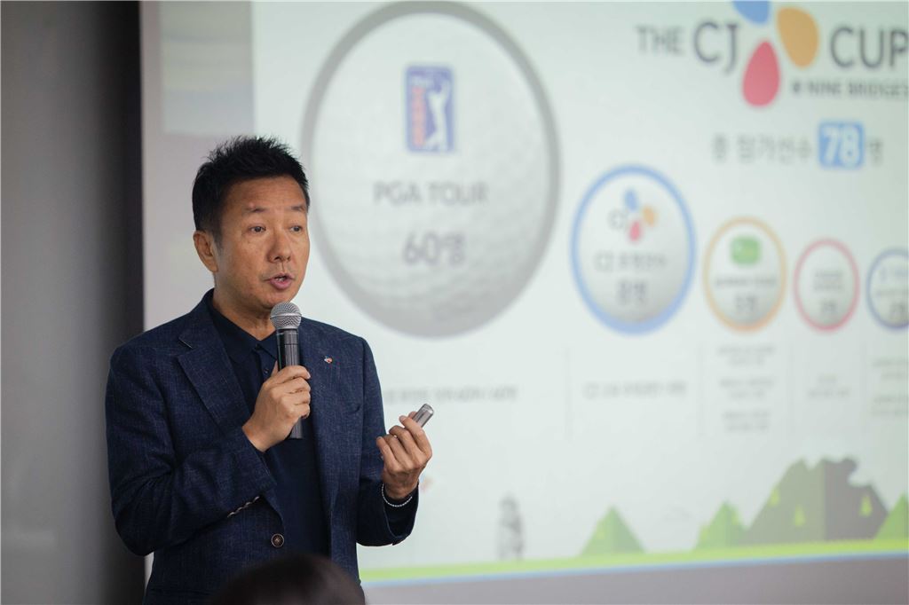 [아시아경제 이선애 기자] "CJ컵(CJ CUP)을 한국을 대표하는 '스포츠ㆍ문화 플랫폼'으로 키워 K-컬처(한국문화) 확산에 기여하겠습니다."한국 선수들이 PGA에 진출하는 다리, 한국 남자 골프시장 활성화를 위한 다리, 국내 골프 산업의 발전을 위한 다리, 골프 관련 중소기업들의 해외 시장 진출의 다리, K-컬처 확산을 위한 다리. 이재현 CJ그룹 회장은 다음달 19일부터 한국 제주의 클럽 나인브릿지에서 나흘 동안 열리는 '더 CJ컵(THE CJ CUP @ NINE BRIDGES)'의 의미를 '재능과 도전 정신을 가지고 있는 모두의 꿈을 실현시킬 수 있는 연결 다리'라고 정의했다. CJ컵은 국내에서 처음 열리는 미국 PGA투어 정규대회다. CJ그룹은 이번 시즌을 시작으로 2026년까지 10년간 이 대회를 개최할 계획이다.이 회장은 이번 대회를 단순한 골프 대회가 아닌 한국을 대표하는 스포츠ㆍ문화 플랫폼으로 키워 한국 식문화, 콘텐츠, 브랜드 등 K-컬처 확산 계기로 삼을 방침이다.경욱호 CJ 마케팅실 부사장은이 19일 서울 중구 CJ제일제당센터에서 'CJ 컵 D-30 미디어데이'행사를 갖고 대회 개최 의미와 중장기 계획, 글로벌 브랜딩 전략에 대해 발표하고 있다.