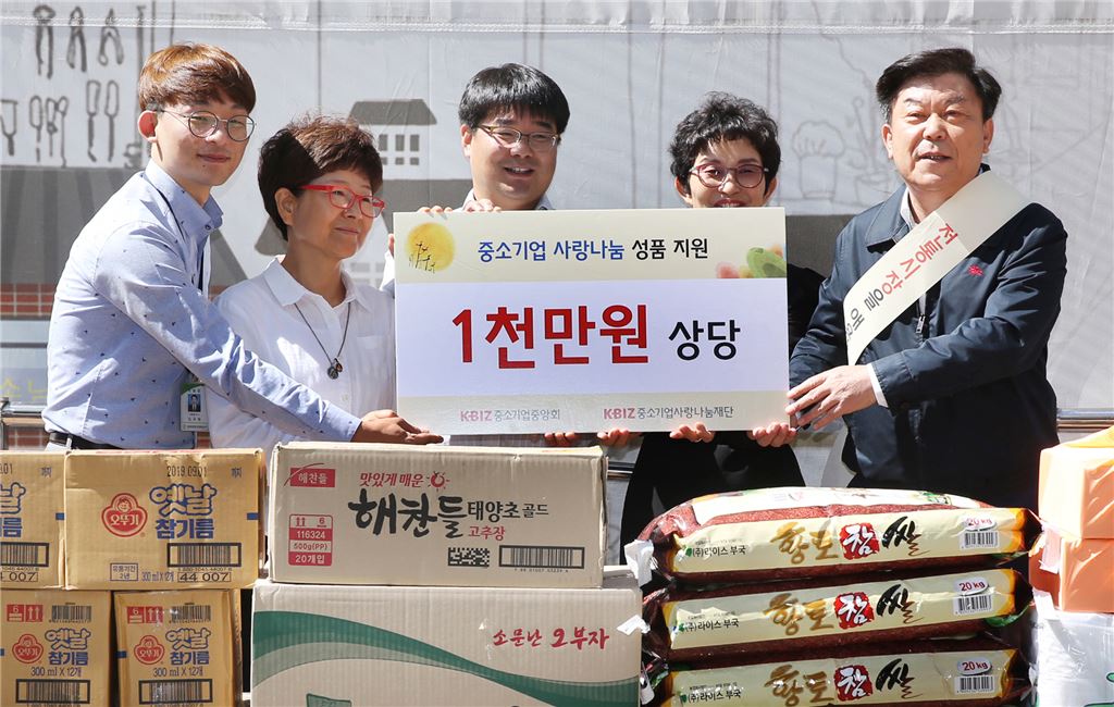 박성택 중소기업중앙회 회장(오른쪽 첫 번째)과 사회복지시설 관계자 등이 20일 서울 마포 소재 망원동월드컵시장·망원시장에서 열린 '추석맞이 전통시장과 함께하는 사랑나눔' 행사에 참석해 기념촬영을 하고 있다. 이날 중소기업사랑나눔재단이 후원한 온누리상품권 1000만원으로 추석맞이 다양한 물품을 구매했다.
