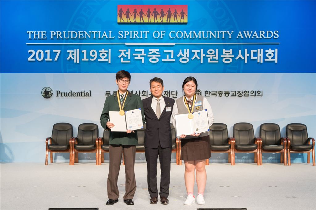 제19회 전국중고생자원봉사대회에서 여성가족부 장관상을 수상한 홍혁준 군(아시아퍼시픽 국제외국인학교·왼쪽).