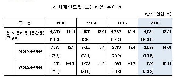 [아시아경제 이광호 기자]지난해 기업에서 근로자 1명을 쓰는 데 들어간 비용은 월평균 493만4000원인 것으로 조사됐다.21일 고용노동부의 '2016 회계연도 기업체노동비용조사'에 따르면 2016 회계연도의 상용근로자 10인 이상 기업체 2850곳의 1인당 월평균 노동비용은 493만4000원으로 2015년 478만2000원보다 3.2%(15만3000원) 증가했다. 노동비용은 직접노동비용과 간접노동비용으로 구분된다. 직접노동비용은 간접노동비용은 정액·초과급여, 상여금 등 임금으로 구성되며, 간접노동비용은 퇴직급여, 법정노동비용(4대 보험 등), 법정 외 복지비용(주거·식사비·건강보건 등), 채용·교육훈련비로 나뉜다.노동비용 증가율은 2013년 1.4%에서 3년 새 3.2%로 1.8%포인트 뛰었다. 직접노동비용은 393만8000원으로 지난해 보다 4.0%, 간접노동비용은 99만6000원으로 0.1% 증가했다.직접노동비용 항목 중 정액 및 초과급여는 317만5000원으로 지난해 보다 3.8% 증가했고, 상여금 및 성과급은 76만3000원으로 5.0% 늘었다.간접노동비용 항목 중 채용관련비용(10.9%), 법정노동비용(3.6%), 퇴직급여(0.7%)는 증가한 반면, 교육훈련비용(-11.3%)과 법정 외 복지비용(-5.6%)은 감소했다.