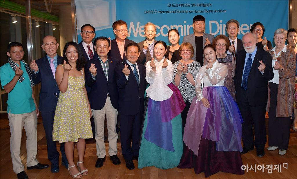 [아시아경제 노해섭 기자] 윤장현 광주광역시장이 20일 오후 동구 국립아시아문화전당 트레블라운지에서 열린 '유네스코 세계 인권기록 국제학술회의' 리셉션에 참석해 국내·외 인권전문가 등 주요 인사들과 기념촬영을 하고 있다.