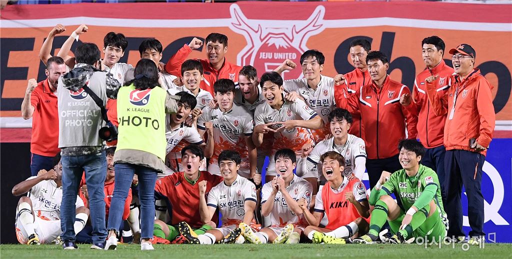 [수원=아시아경제 김현민 기자]프로축구 수원 삼성과 제주 유나이티드의 2017 K리그 클래식 경기가 20일 수원월드컵경기장에서 열렸다. 제주 선수들이 3-2 승리를 확정한 뒤 기념 사진을 찍고 있다. 김현민 기자 kimhyun81@asiae.co.kr<ⓒ세계를 보는 창 경제를 보는 눈, 아시아경제(www.asiae.co.kr) 무단전재 배포금지>
