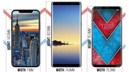 왼쪽부터 아이폰X, 갤럭시노트8, V30 렌더링 이미지 비교 사진.(사잔=유튜브)