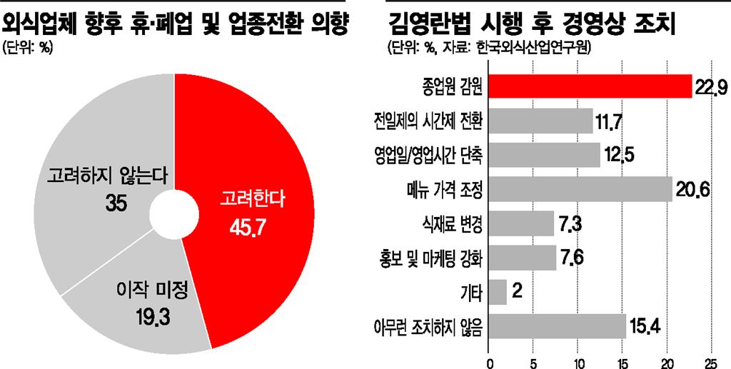 청탁금지법 시행 1년간 외식업체 3곳 중 2곳의 매출이 줄어든 것으로 조사됐다. 한국외식업중앙회 산하 외식산업연구원이 법 시행 1년을 맞아 지난 11~15일 외식업체 420곳을 대상으로 전화와 모바일 설문 조사한 결과다. 외식산업연구원은 "전체 외식업체의 66%가 청탁금지법 시행으로 매출이 감소했고, 이들의 평균 매출 감소율은 22%"라고 밝혔다.외식업체들은 법 시행 후 경영난을 타개하기 위해 '종업원 감원'(22%), '메뉴 가격 조정'(20%), '영업일이나 영업시간 단축'(12%)에 나선 것으로 나타났다. 특히 외식업체 10곳 중 7곳(75%)은 수익 악화를 타개하기 위해 '고용 인력 감원을 고려한다'고 응답했다. 상황이 이렇다보니 외식 자영업자들의 폐업이 속출하고 있으며, 폐업을 하지 않고 버티는 곳은 빚에 허덕이고 있다. 한국은행에 따르면 자영업자가 은행 등에서 받은 대출은 480조2000억원으로 1년 전인 2015년 말(422조5000억원)보다 57조7000억원(13.7%) 급증했다. 자영업자 대출 증가율은 2013년(8.6%)과 2014년(7.6%)에는 10% 미만이었다가 2015년 13.5%로 급등한 뒤 고공행진을 이어갔다.자영업 폐업이 속출하면서 거리 곳곳에 '임대문의' 글이 띄고 있다.