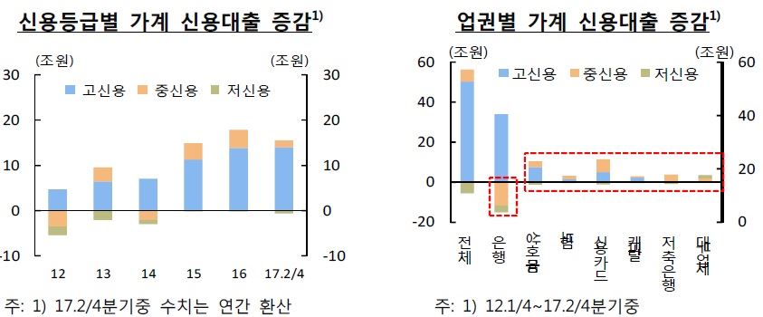 [아시아경제 조은임 기자]중신용자(4~6등급) 대출수요가 저축은행, 신용카드사 등 비은행권에 집중된 것으로 나타났다. 은행의 중신용자 신용대출 규모가 지난 5년여간 11조원 넘게 감소한 반면 비은행권에서는 17조원 이상 늘었다. 은행들이 리스크 관리를 위해 대출 문턱을 높이면서, 중신용자들의 금리부담이 더욱 높아졌다는 지적이 뒤따른다. 한국은행이 21일 발표한 '9월 금융안정상황 점검회의' 결과에 따르면 2012년 1분기부터 올해 2분기까지 비은행금융기관의 중신용자 신용대출은 17조6000억원 증가했다. 반면 은행의 중신용자 신용대출은 같은 기간 11조7000억원 감소했다. 이에 전체 금융기관에서는 중신용자 신용대출 규모가 5조9000억원 늘어나는 데 그쳤다.은행권에서 리스크 관리를 강화하고, 주택담보대출 수요가 늘어난 영향이 크다. 은행의 대출심사를 통과하지 못한 중신용자들이 신용카드사, 저축은행 등으로 발길을 돌린 것이다. 같은 기간 신용카드사의 중신용자 신용대출은 6조4000억원, 저축은행에서는 3조7000억원 늘었다. 이 때문에 비은행권에서는 중신용자의 신용대출 비중이 높은 수준을 보이고 있다. 비은행권에서 실행되는 신용대출 중 중신용자의 비중은 43~64%를 차지했다. 특히 저축은행과 신용카드사가 각각 63.7%, 60.2%로 비중이 높았다. 반면 은행은 고신용자(1~3등급)가 77.9%로 큰 비중을 보였고, 대부업체에서는 저신용자(7~10등급)가 73.1%를 기록했다. 업권별 중신용자 신용대출 규모는 은행이 20조5000억원, 신용카드사가 18조2000억원, 상호금융이 11조5000억원, 저축은행이 6조1000억원 순을 나타냈다. 전체 금융권에서는 고신용자들의 신용대출이 급격하게 늘어나는 추세다. 고신용자 신용대출 규모는 올해 2분기말 기준 114조8000억원(55.3%)으로 전체(207조7000억원)의 절반을 넘어섰다. 중신용자와 저신용자는 각각 67조1000억원(32.3%), 25조8000억원(12.4%)을 기록했다. 고신용자 신용대출의 경우 2012년 4조7000억원 증가하는 데 그쳤지만 올해 들어선 상반기에만 14조원 늘었다.자료:한국은행