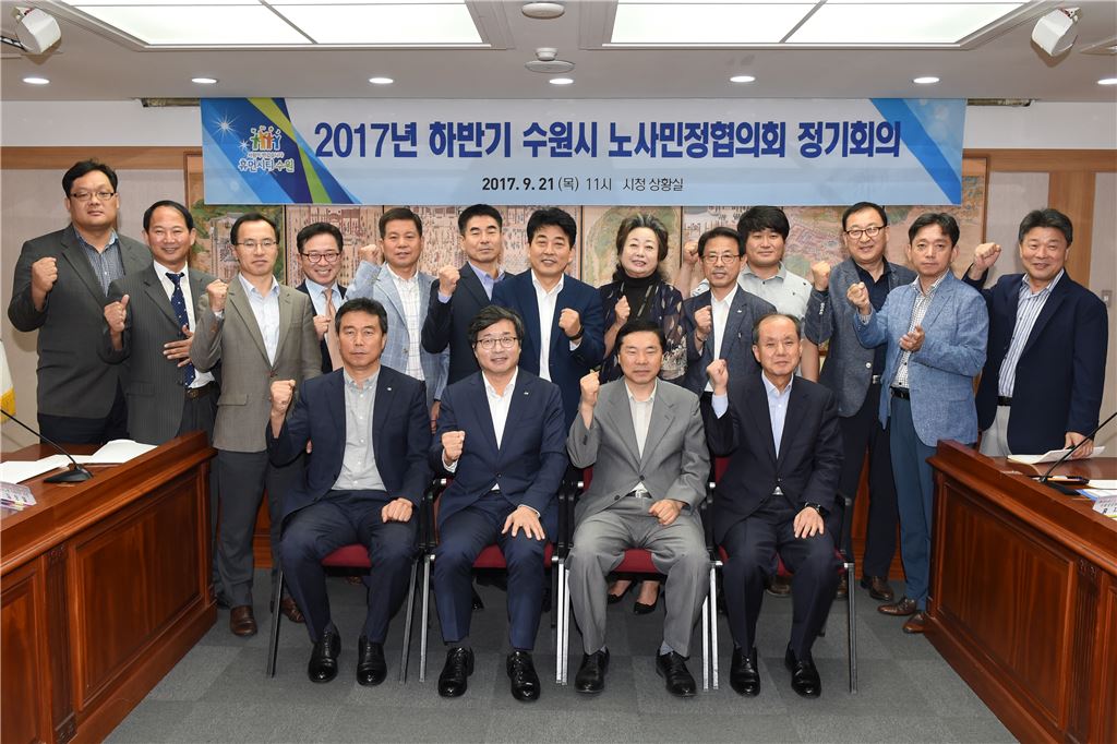 염태영 수원시장(앞줄 왼쪽 두번째)과 노사민정협의회 위원들이 내년 생활임금을 결정한 뒤 기념사진을 찍고 있다.
