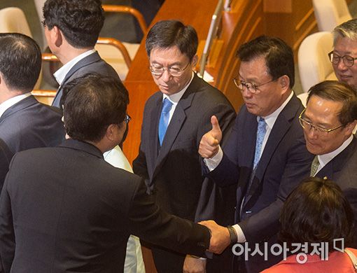 [아시아경제 윤동주 기자] 21일 김명수 대법원장 후보자 임명동의안 표결을 위한 본회의에서 재적 298명 가운데 찬성 160표, 반대 134표, 기권 1표, 무효 3표로 가결되자 박광온 더불어민주당 의원이 우원식 원내대표에게 엄지척 하며 축하를 보내고 있다.윤동주 기자 doso7@asiae.co.kr<ⓒ세계를 보는 창 경제를 보는 눈, 아시아경제(www.asiae.co.kr) 무단전재 배포금지>