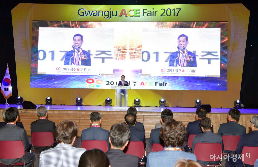 [아시아경제 노해섭 기자]윤장현 광주광역시장이 21일 오전 서구 김대중컨벤션센터 1층 다목적홀에서 열린 2017 광주 ACE FAIR(Asia Content & Entertainment Fair in Gwangju) 개막식에 참석해 인사말을 하고 있다. 오는 24일까지 나흘간 열리는 이번 행사는 38개국 440개사가 참가해 전시회, 특허사용계약 상담회, 학술행사, 특별 부대행사 등이 진행된다.