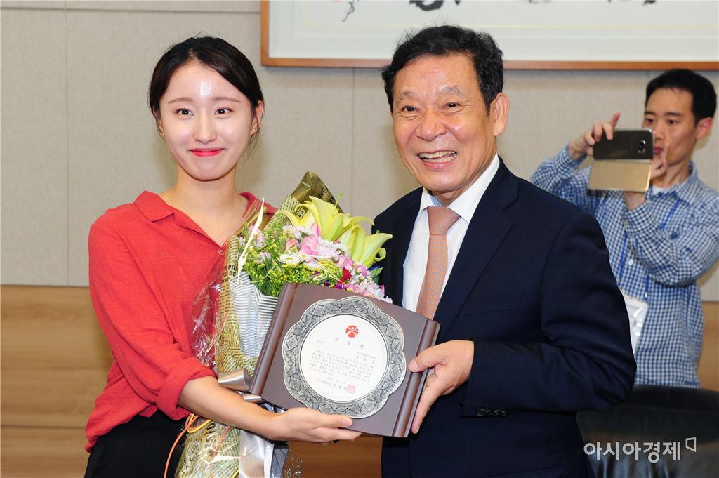 [아시아경제 노해섭 기자]윤장현 광주광역시장은 21일 오후 시청 접견실에서 쓰러진 노인에게 선행을 행한 이호정(여/보건대 간호학과 3학년)학생에게 표창패를 수여 했다. / 광주광역시 제공<ⓒ세계를 보는 창 경제를 보는 눈, 아시아경제(www.asiae.co.kr) 무단전재 배포금지>